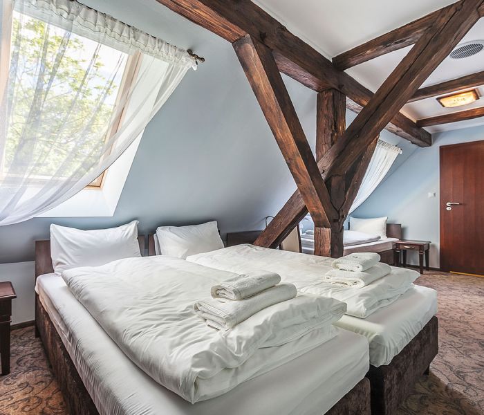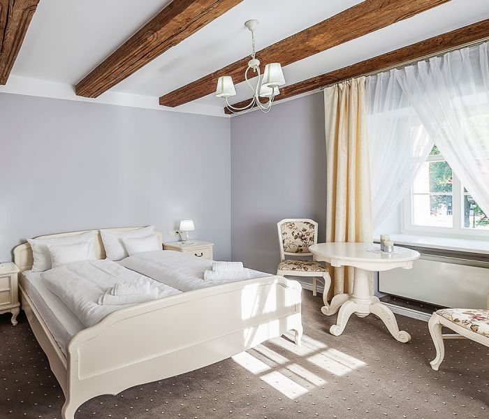 Pokoje w Pałacu są jasne i przestronne, komfortowo umeblowane w klasyczne meble. Wyposażone są w wygodne łóżka, w telewizor LCD, mini lodówkę, biurko, pojemną szafę, stół z krzesłami, sejf. W pokojach są łazienki z kabiną prysznicową i suszarką, ręczniki, kosmetyki hotelowe.