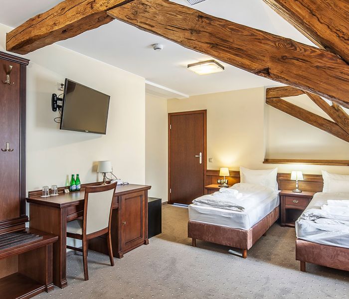 Część wypoczynkowa wyposażona jest w biurko, komodę, stylowy komplet wypoczynkowy, garderobę, mini lodówkę. Do dyspozycji Gości, w pokoju znajduje się sejf. Łazienka wyposażona została w kabinę prysznicową.